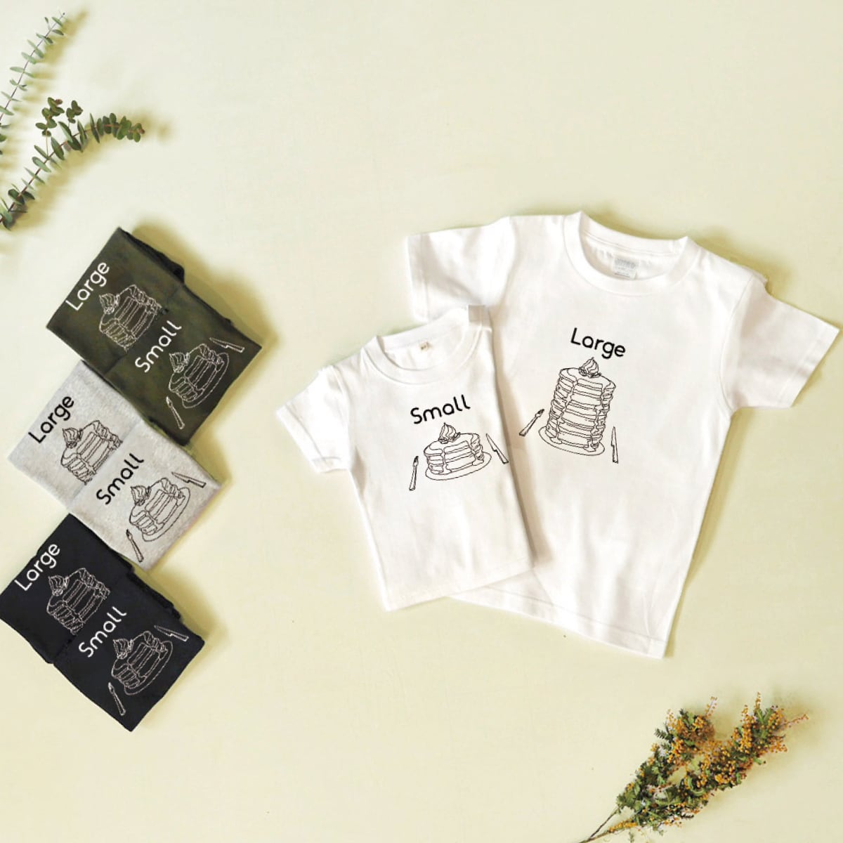 Tシャツにはそれぞれ「Small」「Large」サイズの文字とパンケーキがプリントされています。